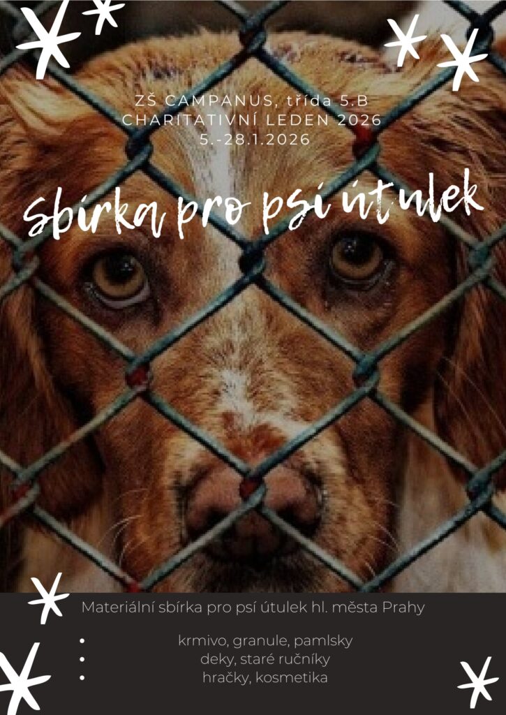 Budeme rádi za jakýkoliv pamlsek, hračku nebo dečku. Vše můžete odevzdat ve třídě 5.B nebo na vrátnících školy, maximálně však do 28.1.2026. Den poté máme zajištěn odvoz materiálu, a také jedeme pejsky navštívit.