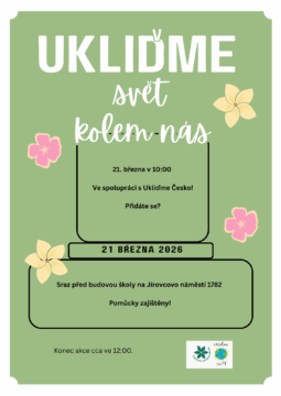 K dispozici budou pracovní rukavice, nářadí a pytle na odpad, ale uvítáme, pokud si přinesete rukavice vlastní, příp. i vlastní nářadí. Sraz všech účastníků bude před hlavními vchody na Jírovcově náměstí v 10 hodin. Uklízet budeme areál školy a přilehlé okolí.